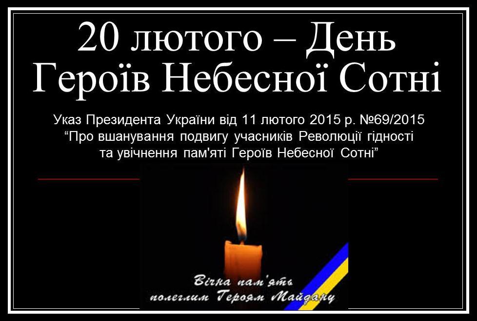 Україна вшановуватиме пам’ять Героїв Небесної Сотні – героїв першої перемоги у битві, що триває за збереження України на мапі світу, за нашу державність, щоб ми не дали себе поглинути у рази більшим за розміром, але цинічним і морально дрібним північно-східним сусідом.